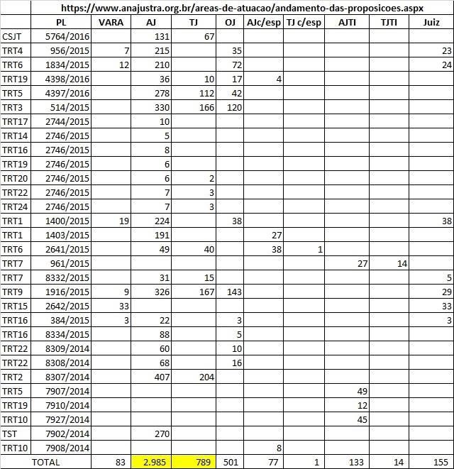 Em alguns casos, mesmo criando novas Varas, não se cria qualquer cargo de técnico. Veja os exemplos: 1) TRT1 – PL 1400/2015 – Criará 19 Varas, 224 AJ, nenhum TJ. 2) TRT4 – PL 956/2015 – Criará 7 Varas, 215 AJ, nenhum TJ. 3) TRT6 – PL 1834/2015 – Criará 12 Varas, 210 AJ,nenhum TJ. 4) TRT16 – PL 384/2015 – Criará 3 Varas, 22 AJ, nenhum TJ.
