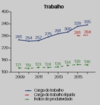 Outro estímulo à evasão foi o aumento da carga de trabalho. Esta, por servidor da Justiça do Trabalho, aumentou em 28% de 2009 a 2016. O gráfico retirado do Justiça em Números do CNJ de 2017 com dados até 2016 comprova o aumento da carga de trabalho.