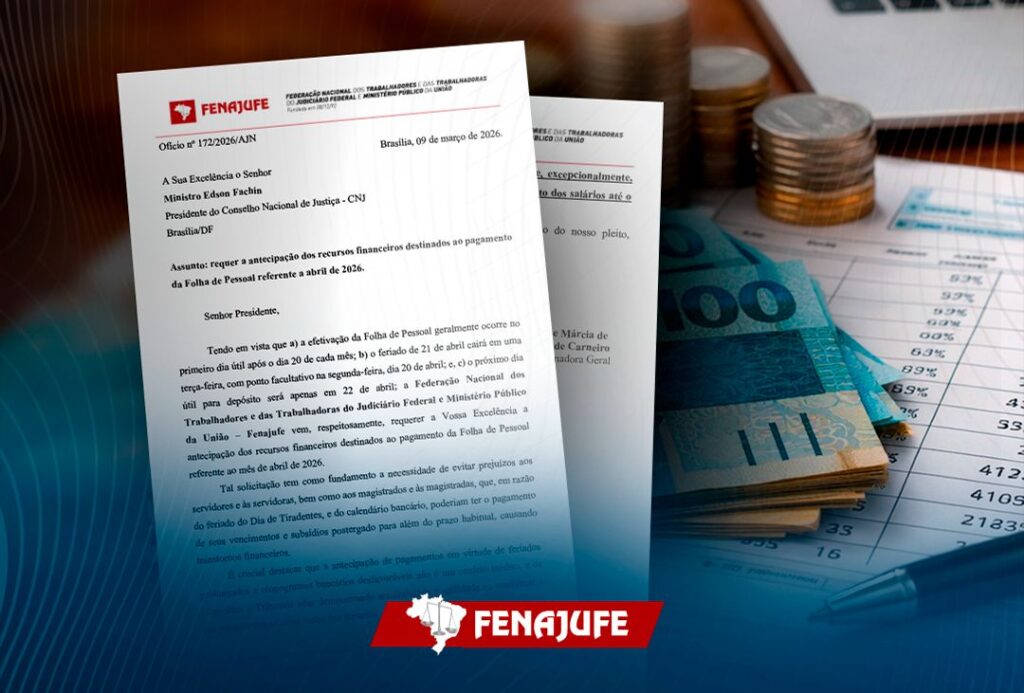 A Fenajufe encaminho ofício aos órgãos do PJU e do MPU, nessa segunda-feira (9), solicitando a antecipação da liberação dos recursos destinados ao pagamento da folha de pessoal de abril de 2026. A solicitação tem como base o feriado de Dia de Tiradentes, em 21 de abril, que pode impactar o calendário bancário e atrasar o crédito dos salários.