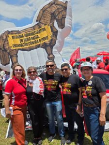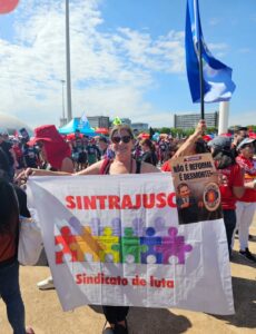 Com participação estimada em 10 mil pessoas, a Marcha Nacional do Serviço Público contra a Reforma Administrativa, realizada na manhã desta quarta-feira, 29, na Esplanada dos Ministérios, em Brasília, reuniu categorias das três esferas e trabalhadores e trabalhadoras da iniciativa privada de todo o Brasil. O Sintrajusc foi representado pela coordenadora Maria José Olegário, que também é coordenadora da Fenajufe e está em Brasília. A mobilização, organizada pela CUT e outras centrais sindicais, denunciou o caráter destrutivo da proposta de Hugo Motta (REP-PB) e Pedro Paulo (PSD-RJ) e cobrando dos parlamentares a retirada imediata da proposta de emenda à Constituição (PEC) 38/2025.