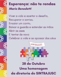 Sintrajusc terá expediente alterado em razão do Dia do Servidor Público 30 de outubro de 2025 Miriam Destaques, Notícias, Slider Comentários desativados em Sintrajusc terá expediente alterado em razão do Dia do Servidor Público Acompanhando o calendário das três justiças para o feriado do Dia do Servidor Público, comemorado em 28 de outubro, o Sintrajusc não terá expediente nesta sexta-feira, dia 31.